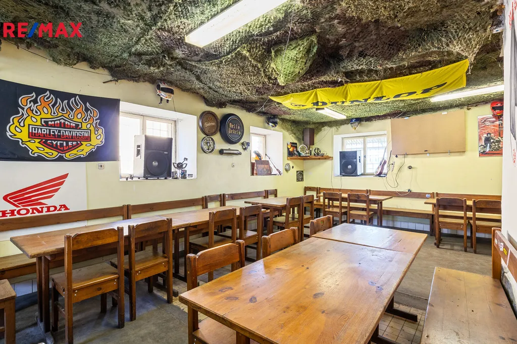 Nemovitost je částečně zrekonstruována a momentálně slouží jako zázemí dnes stále fungujícího motorkářského klubu. Najdete zde zařízenou kuchyň, stylový bar s prostorným sálem, pokoj pro zázemí, koupelnu, toalety a mnoho sklepních místností. Celkem tedy 129 m2 užitné plochy vhodné pro vytvoření útulného bydlení, k tomu téměř 100 m2 sklepních místností, a kryté venkovní sezení. Rozsáhlé podkroví nabízí možnost dostavby dalšího patra, a tím ještě rozšíření obytných nebo komerčních prostor.