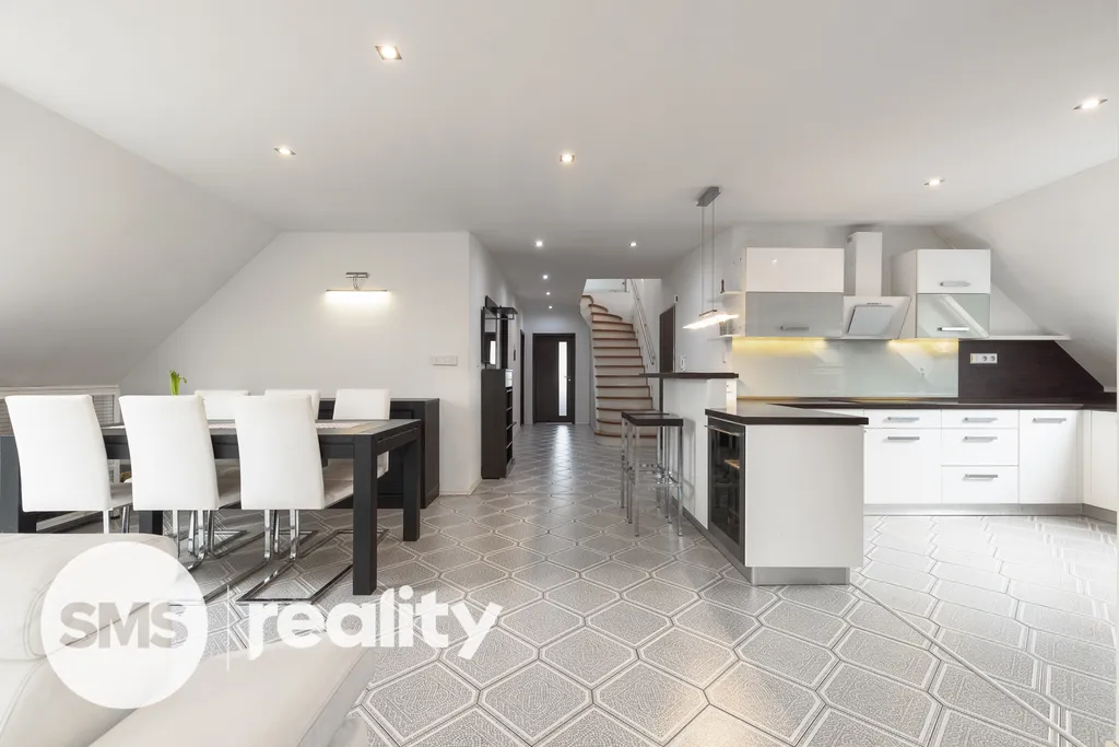 Spodní patro o velikosti 116 m² je navrženo jako plnohodnotné rodinné bydlení. Najdete zde dětský pokoj, pracovnu, ložnici s vlastní šatnou a dominantní otevřený obytný prostor s kuchyní a jídelnou. Obývací část je skutečně velkorysá, ideální pro rodinný život i návštěvy. Kuchyně nabízí nadstandardní množství pracovní plochy, vestavěné spotřebiče a navazuje na stylovou vinárnu.