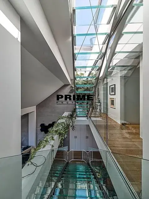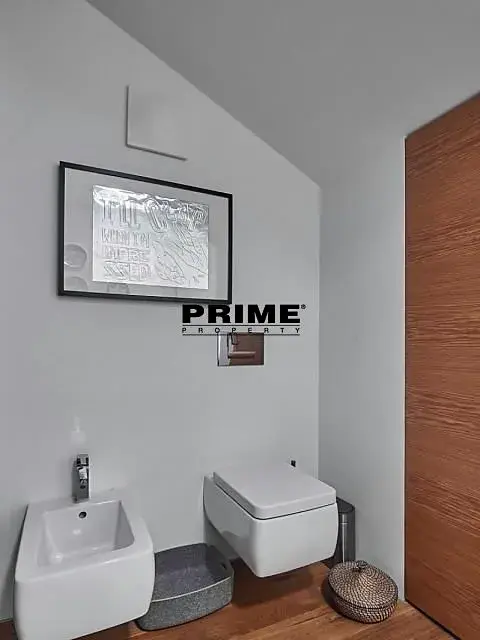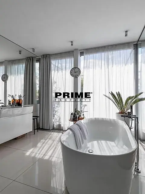 Dispozice dolní části bytu: prostorný obývací pokoj (100m2) s jídelní částí, plně vybaveným, moderním kuchyňským koutem se spotřebiči a vstupem na terasu 24m2 směřující do klidného dvora a WC. Horní podlaží: hlavní ložnice s prostornou šatnou, s vlastní koupelnou (s vanou, sprchovým koutem a dvěma umyvadly) a WC (toaleta, bidet), další dvě ložnice se společnou koupelnou (s vanou, sprchovým koutem, 2 umyvadly, toaletou a bidetem) a terasa 80m2. Dále k bytu náleží střešní terasa 89m2.