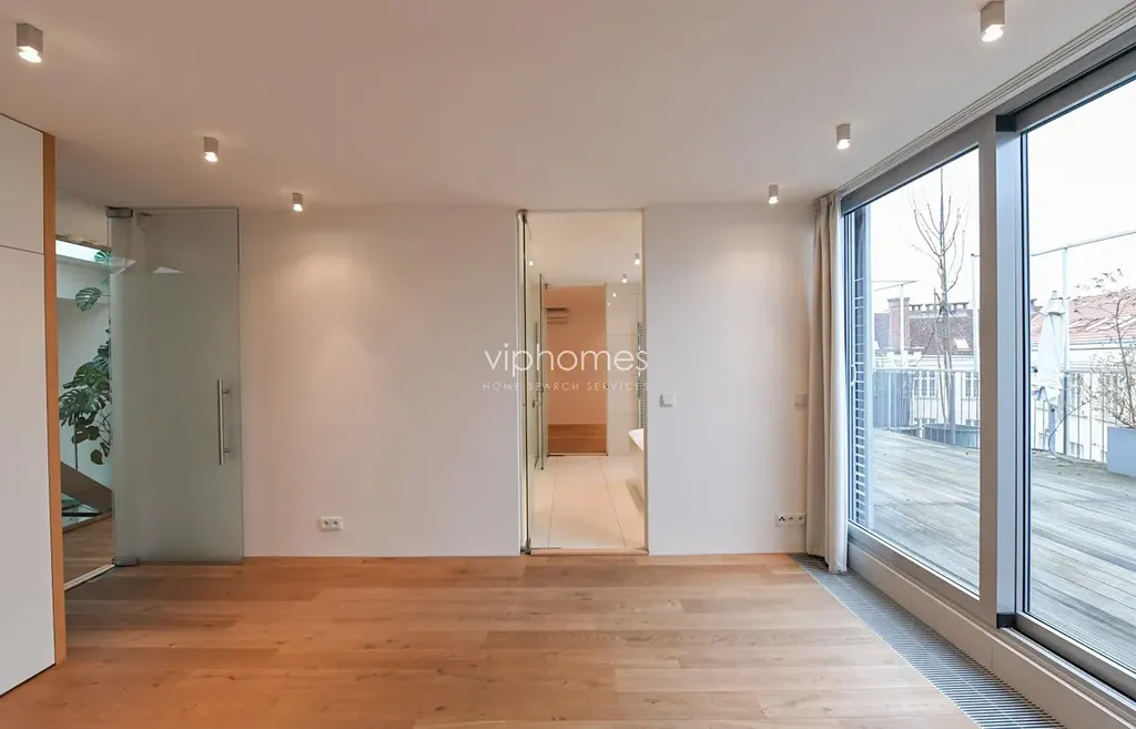 Velký ( 100 m2) přízemní otevřený prostor nabízí obývací pokoj moderně propojený s kuchyňskou linkou, a jídelnu ze vstupem na terasu. Vzdušná kuchyně je vybavena všemi potřebnými spotřebiči (Miele), kombinovaná varná deska, parní trouba, myčka nádobí, lednice s mrazákem. Dominantním prvkem interiéru je závěsný krb v zábavné části obývacího prostoru. Plynový krb je funkčním a zároveň klíčovým dekorativním prvkem, jenž v obytném prostoru vytváří přívětivou atmosféru. V patře je umístěna hlavní ložnice s vlastní koupelnou a velkou vybavenou šatnou, další dvě ložnice ze společnou koupelnou a prostorná galerie. Dvě ložnice mají přístup na velkou terasu s vířivkou. Ve třetím patře byt disponuje nádhernou střešní terasou s okouzlujícími výhledy na panorama Prahy. Interiér je dílem renomovaného architektonického studia Donlic.
