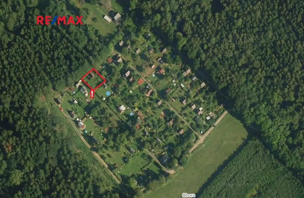 K chatě patří udržovaná oplocená zahrada téměř rovinatého terénu o výměře 404 m2.