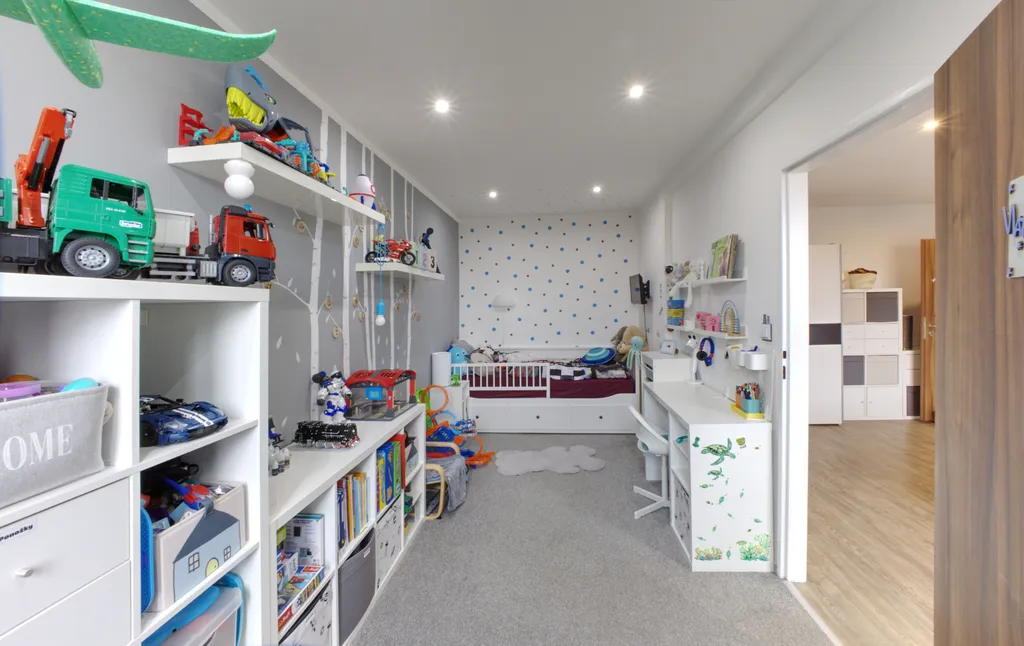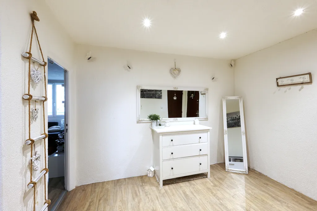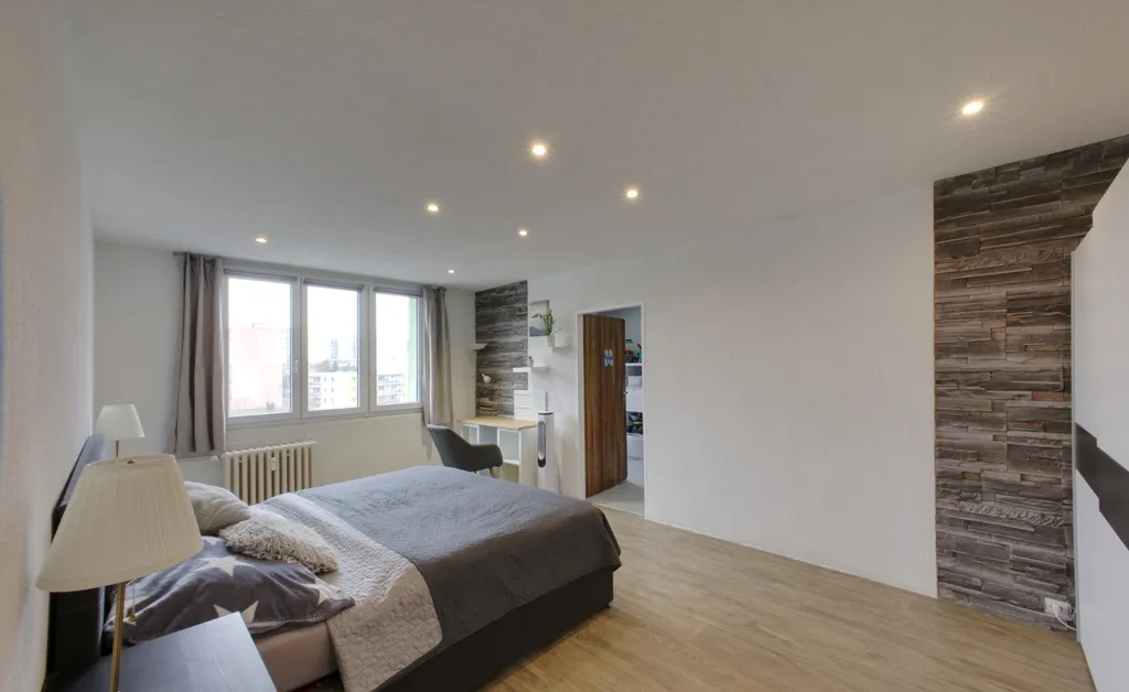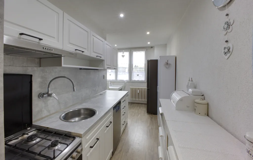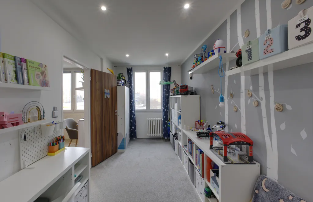 Byt je umístěn ve 4. patře zatepleného panelového domu. Interiér působí moderním dojmem díky sníženým stropům s bodovým osvětlením a dekorativním omítkám. V ložnici a obývacím pokoji jsou použity obklady v dekoru kamene. Lodžie je přístupná z obývacího pokoje. Ložnice, dětský pokoj a kuchyně jsou orientovány na sever. V obytných místnostech je položena plovoucí podlaha, v dětském pokoji koberec. Koupelna je v moderní šedo-bílé kombinaci a nabízí dostatek prostoru pro umístění pračky i sušičky. Kuchyňská linka je vybavena plynovým sporákem, digestoří a myčkou. Praktickým prvkem je prostorná obdélníková předsíň.