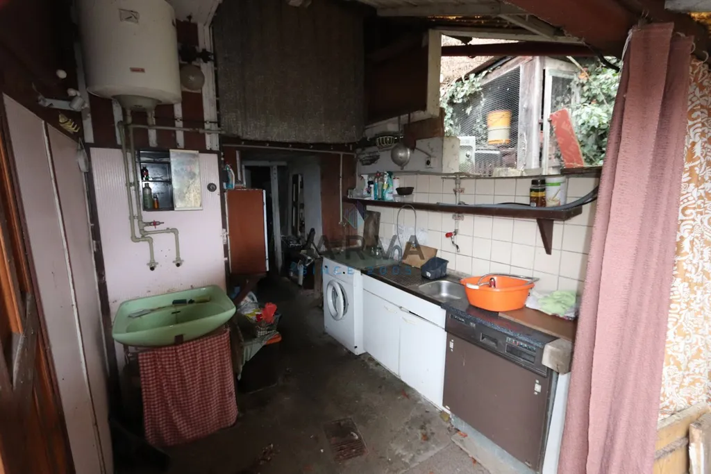 U hlavních dveří za verandou po levé straně je přírodní sprchový kout s umyvadlem a bojlerem na ohřev vody. Po pravé straně letní kuchyň se sporákem s myčkou a pračkou. Za letní kuchyní je napojena kolna na nářadí na lednici a mrazák. WC je zděný od chaty oddělen.