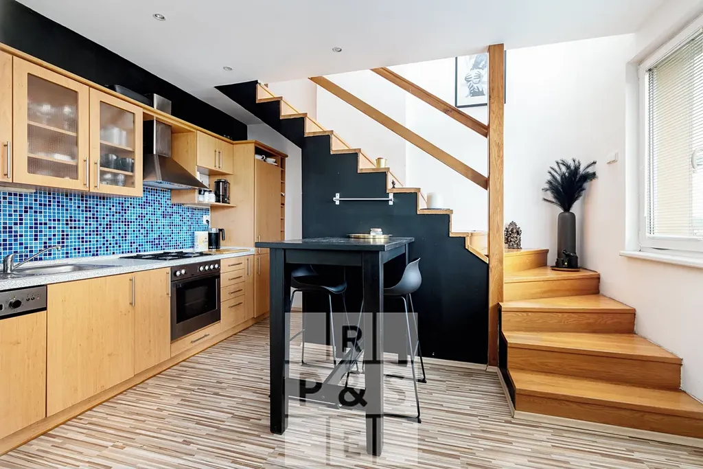 Ve spodním patře se nachází obývací pokoj s menší kuchyní, v horním patře pak prostorná světlá ložnice, velká koupelna a chodba s vestavěnými úložnými skříněmi. K bytu náleží i sklepní kóje. Byt prošel rekonstrukcí, je světlý a připravený k okamžitému nastěhování nebo pronájmu.