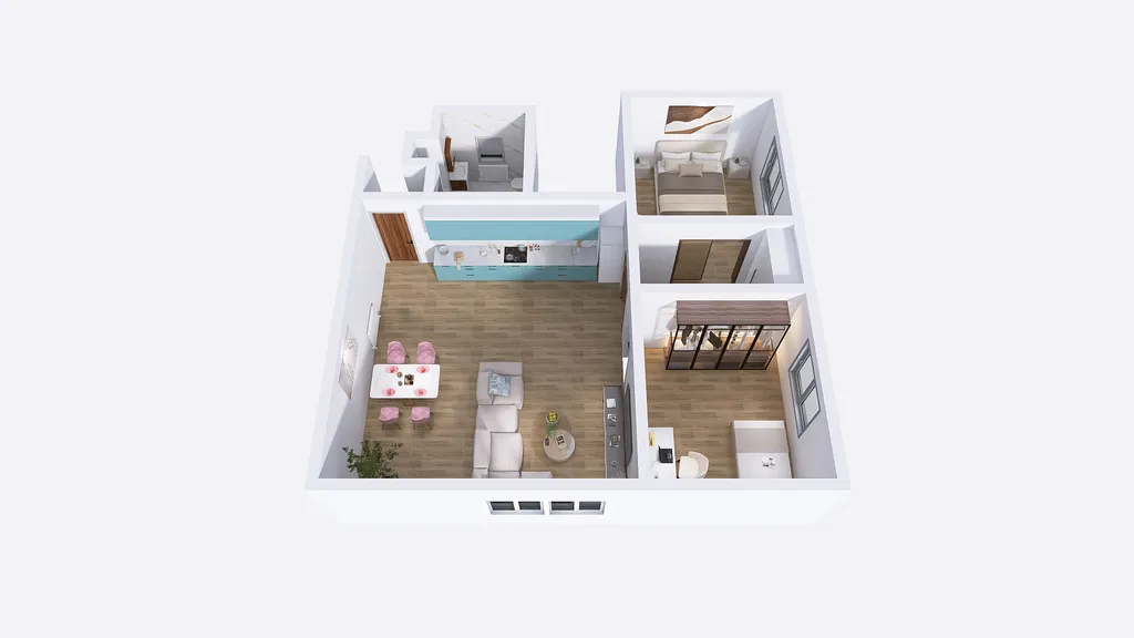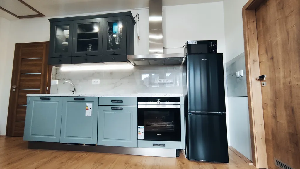 Byt je vybaven kuchyňskou linkou včetně elektrické troubou s indukční varnou deskou, digestoří a prostorem pro lednici nebo možností připojení myčky nádobí. Na obývací místnost s kuchyňským koutem navazují dva neprůchozí pokoje. Koupelna disponuje vanou, umyvadlem, WC a prostorem pro pračku (s bočním otvíráním). Vytápění je řešeno plynovým kotlem přímo v budově a ohřev vody pomocí el. bojleru.
