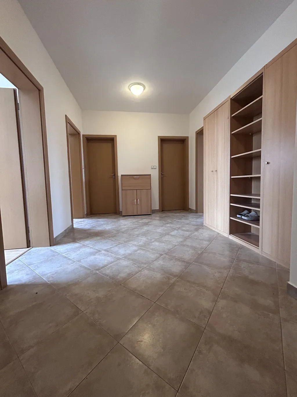 Byt disponuje praktickou a dobře řešenou dispozicí. Dominantou je prostorná předsíň, ze které je vstup do všech místností. Obývací pokoj s kuchyňským koutem nabízí dostatek prostoru pro jídelní i odpočinkovou část a zároveň přímý vstup na první terasu.