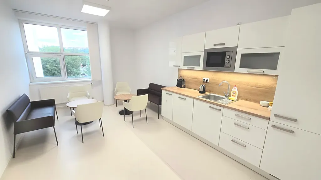 K ceně pronájmu se připočítává pronájem poměrné části společných prostor na daném podlaží (čekárna, kuchyň s jídelnou, šatny, sprchy, sociální zázemí)