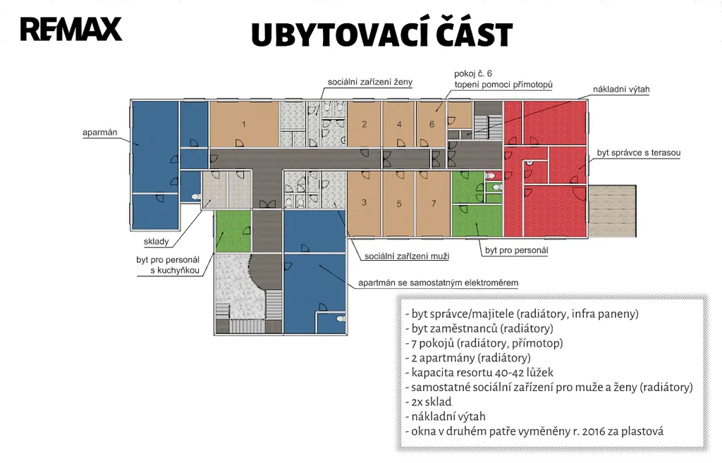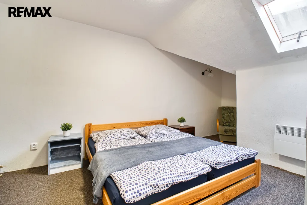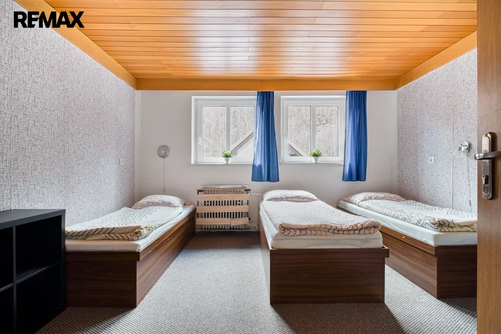 V patře je ubytovací část se 7 pokoji, 2 apartmány s vlastní koupelnou, byty pro personál a samostatný byt 2+1 pro majitele či správce.