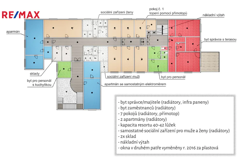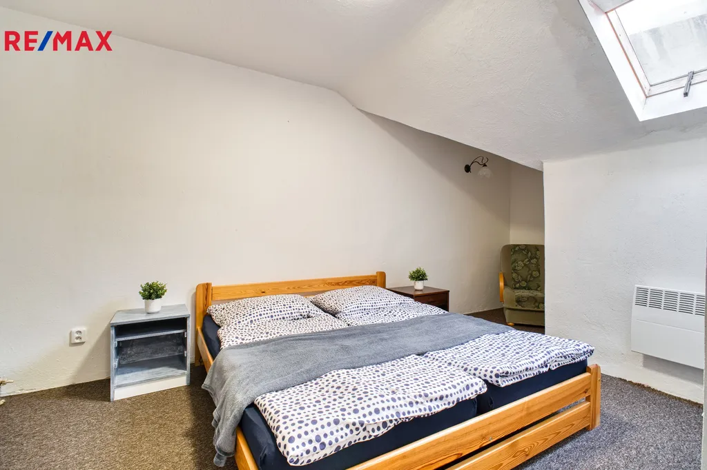 V patře je ubytovací část se 7 pokoji, 2 apartmány s vlastní koupelnou, byty pro personál a samostatný byt 2+1 pro majitele či správce.