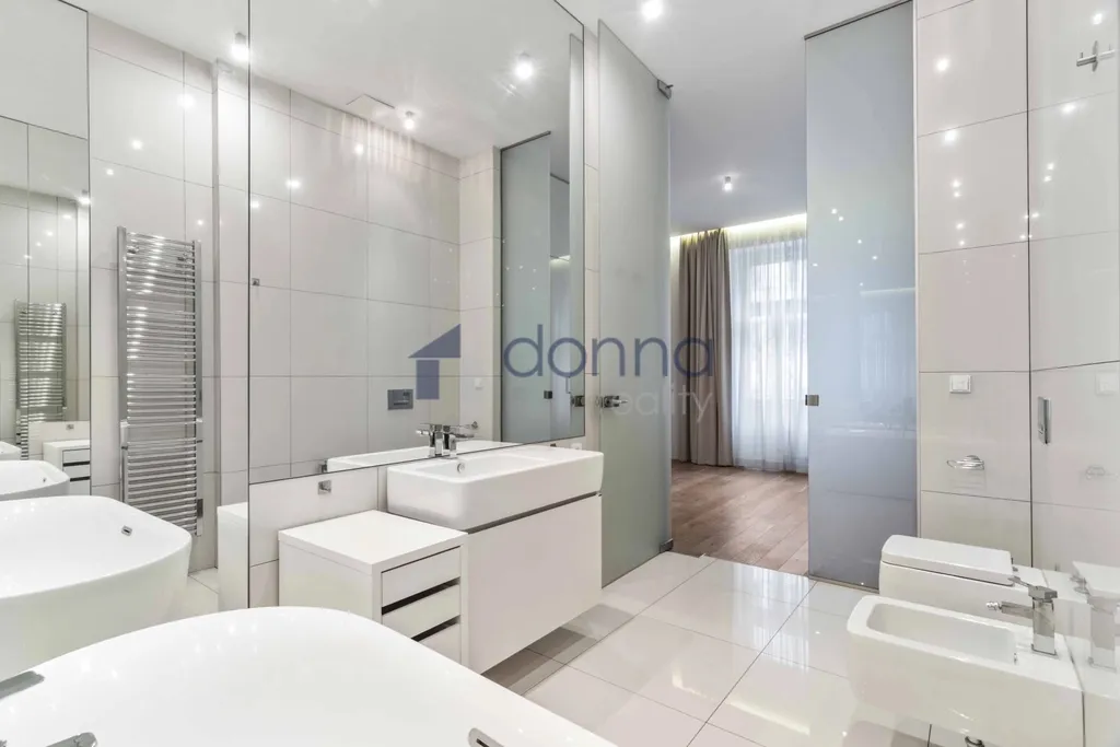 Dispozice bytu: vstupní hala, prostorný obývací pokoj s jídelní částí a plně vybaveným kuchyňským koutem, sklokeramická varná deska, trouba, myčka, lednice s mrazákem, mikrovlnná trouba a přímým vstupem na terasu. 2 ložnice, 2x koupelna (vana a toaleta + sprchový kout a toaleta). Interiér bytu je dílem známého architektonického studia Donlic. Vysoké standardy zahrnují vysokou kvalitu materiálů a zpracování, dřevěné podlahy, dlažba, nová francouzská okna, zabudované stropní osvětlení, centrální vypínač, alarm s možností napojení na PCO, bezpečnostní dveře, videotelefon.