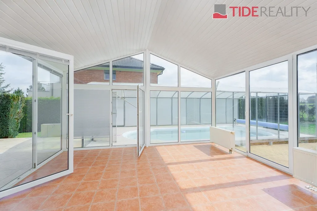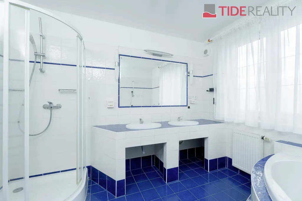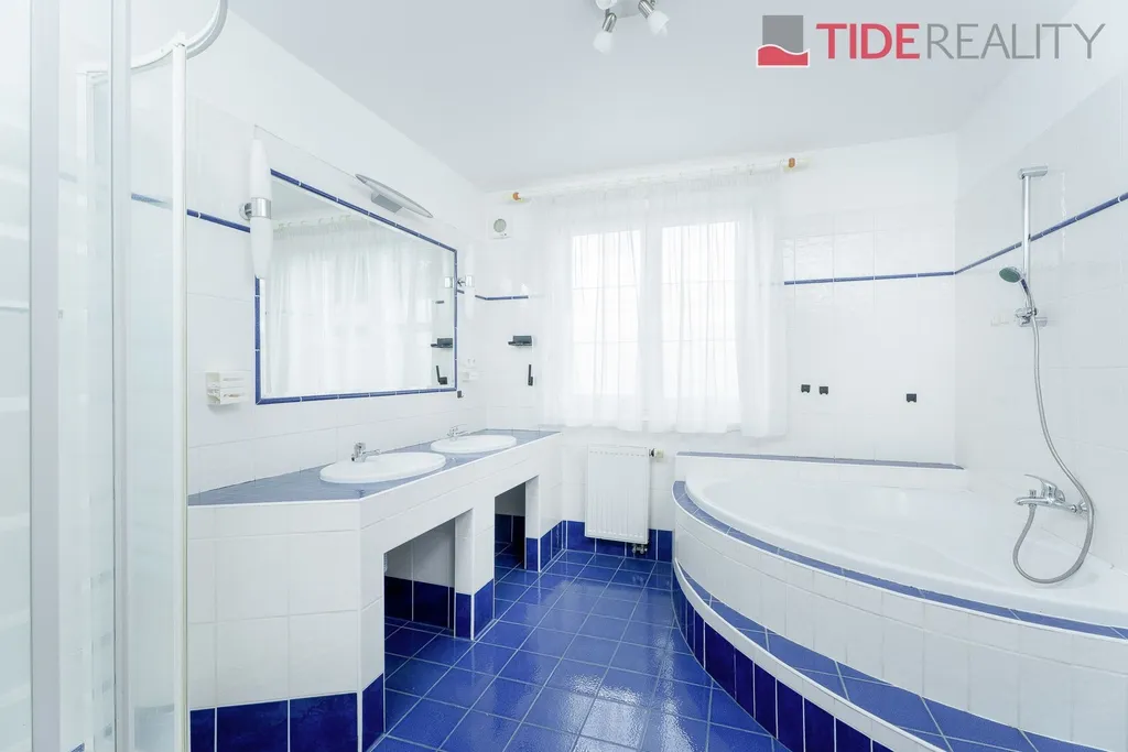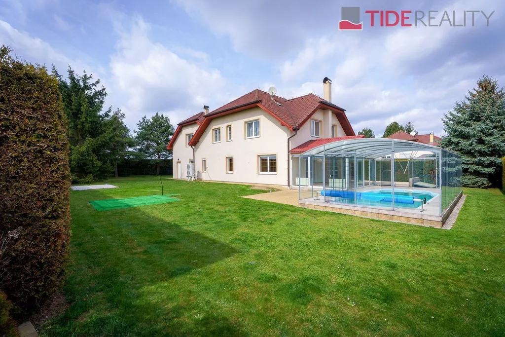 Nabízíme k pronájmu velmi prostorný dům i pro velkou rodinu o celkové užitné ploše 290 m2 s pečlivě udržovanou zahradou o velikosti 560 m2. Ve dvou nadzemních podlažích se rozkládá 5 ložnic, obývací pokoj s krbem propojený s velkou zimní zahradou i krytým vytápěným bazénem s protiproudem, plně vybavená kuchyň, celkem 3 koupelny (jedna ensuite), a samostatná prádelna. Dům je zařízený vestavěnými skříněmi a dostatečným množstvím dalších úložných prostor. Dům je vytápěný prostřednictvím podlahového topení napojeného na hospodárné tepelné čerpadlo, které snižuje celkové energetické náklady. Na pozemku se nachází sauna s potřebným zázemím. Zahrada je vybavena automatickou závlahu. Garáž pro 2 auta, další parkování možné na pozemku před domem. Dům se nachází v klidné vilové čtvrti jen pár kroků do přírody, v nedaleké vzdálenosti i od Průhonického parku. PENB třída C.