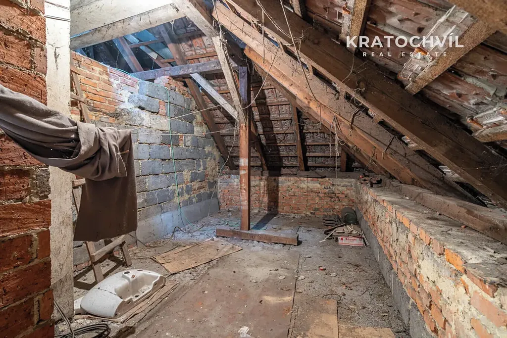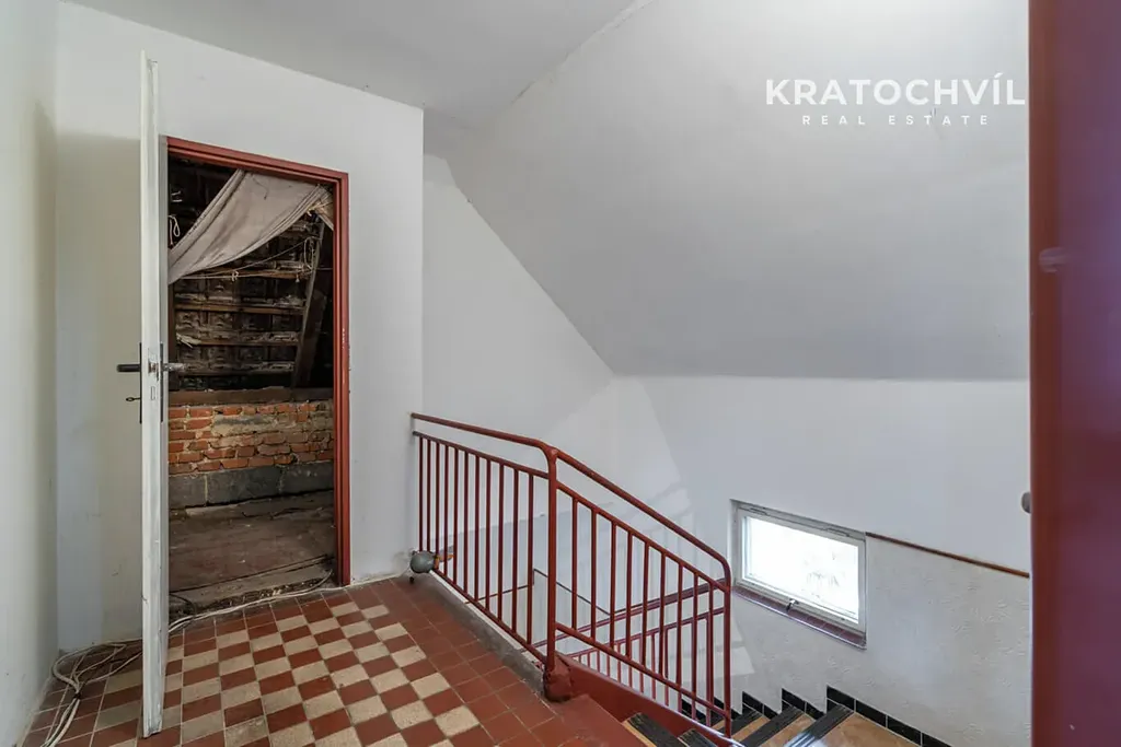 V podkroví je ložnice a pokoj s kuchyňským koutem, dále další dvě části podkroví vhodné pro další vestavbu.