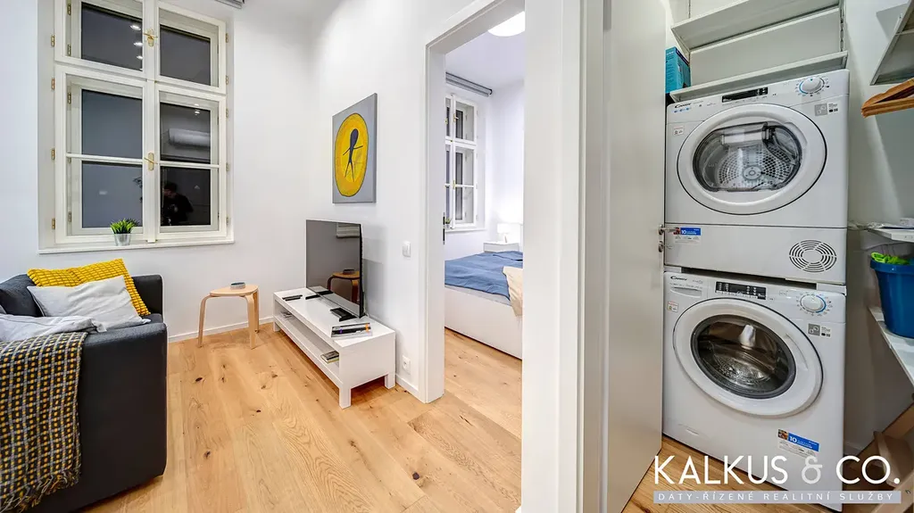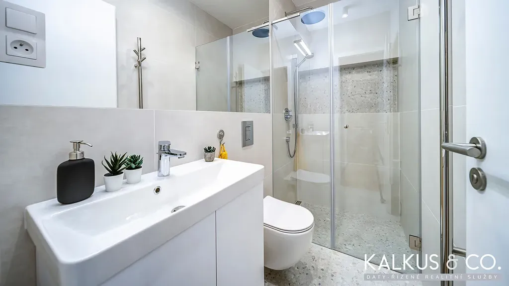 Samostatná komora s pračkou, sušičkou a regálovým úložným systémem je umístěná prakticky bezprostředně u vstupních dveří. Koupelna je vybavena skříňkou s umyvadlem, velkoformátovým zapuštěným zrcadlem a prostorným bezbariérovým sprchovým koutem s podomítkovou baterií, sprchovou hlavou a funkčně estetickou nikou. K dispozici je sklep a vysokorychlostní internet.
