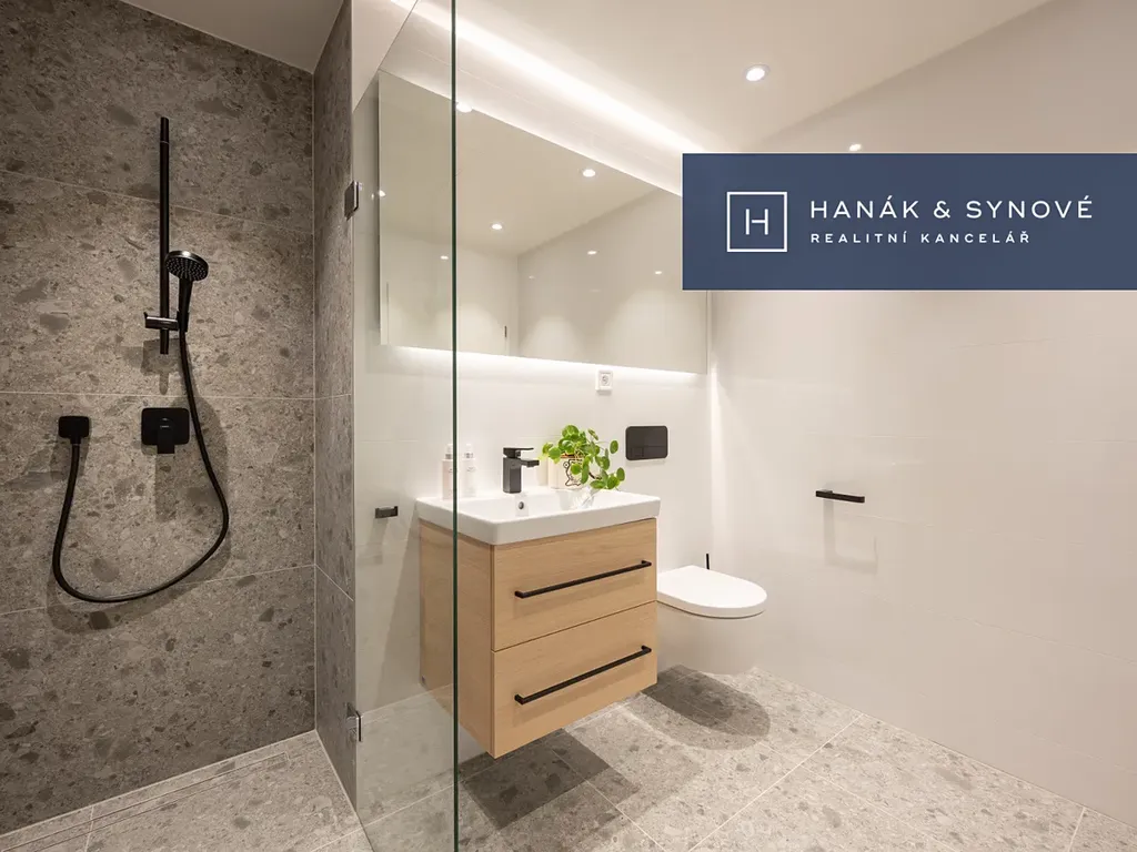 Byt je zařízený ve vysokém standardu a je nabízen kompletně zařízený – kuchyňská linka se spotřebiči (varná deska, digestoř, mikrovlnná trouba, myčka, vestavěná lednice s mrazákem), vestavěná skříň, postel, jídelní stůl se židlemi, botník, věšák, venkovní žaluzie. Koupelna je vybavena walk-in sprchovým koutem se skleněnou zástěnou značky HÜPPE, záchodem a umyvadlem s umyvadlovou skříňkou, podsvíceným zrcadlem a pračkou kombinovanou se sušičkou.