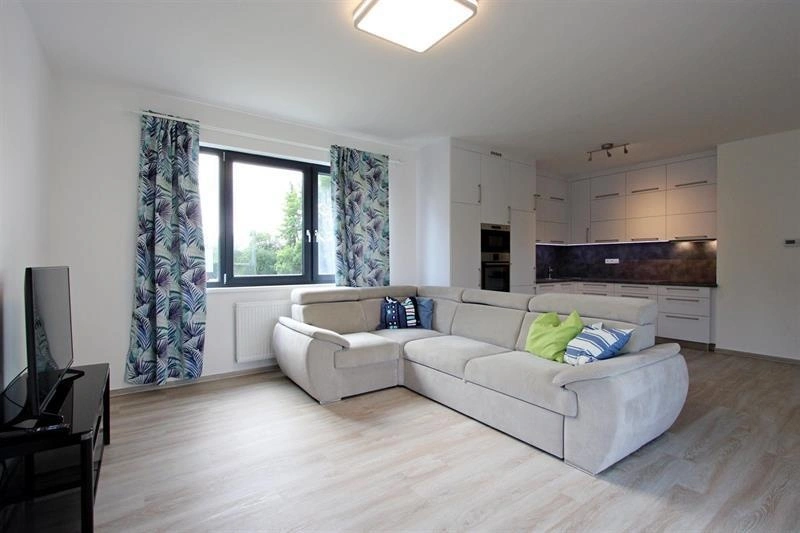 V obývací části je umístěna prostorná rohová rozkládací sedačka, TV stolek a televize.