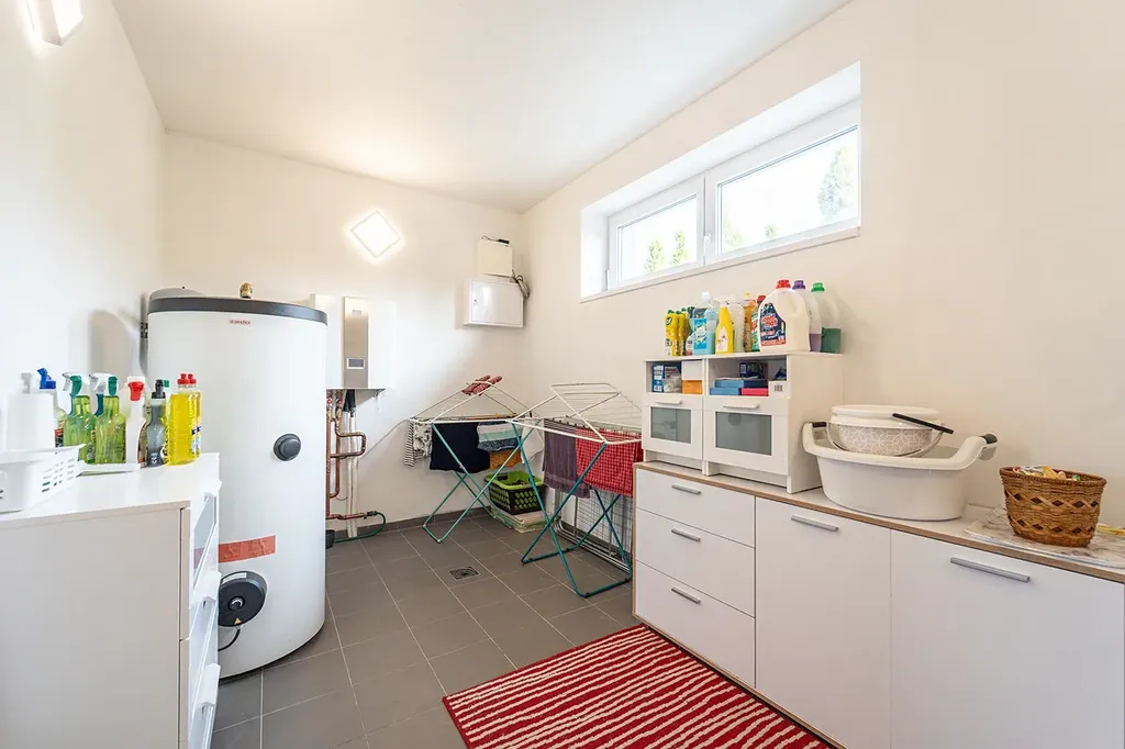 Tepelné čerpadlo v letních dnech nahrazuje klimatizaci a zajistí v domě příjemné teploty. Rozvody jsou vedeny stropem (panel, polystyren) a z tohoto důvodu nelze vrtat do zdí, osvětlení se nachází na zdech a působí jako vhodný designový prvek. Do domu je zaveden plyn, internet, v domě je satelit a videotelefon, který umožňuje otevřít vjezdovou bránu.