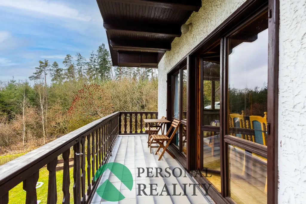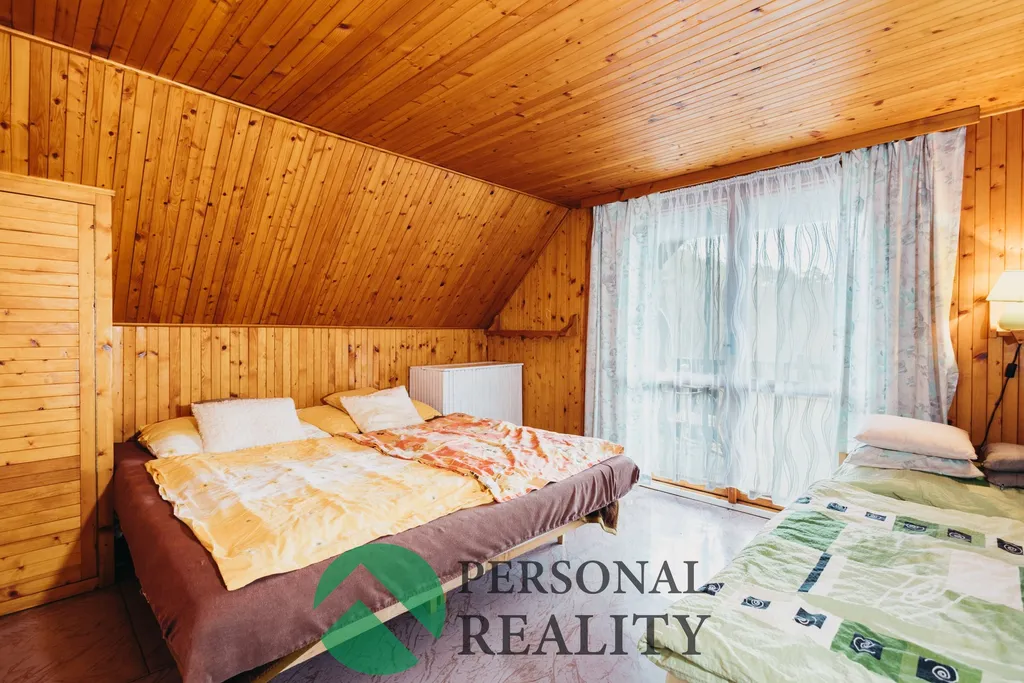 Dispozice horní patro: chodba se vstupem na půdní prostor, dětský pokoj a větší ložnice se vstupem na balkón a krásným výhledem do okolní krajiny směrem k Orlické přehradě.