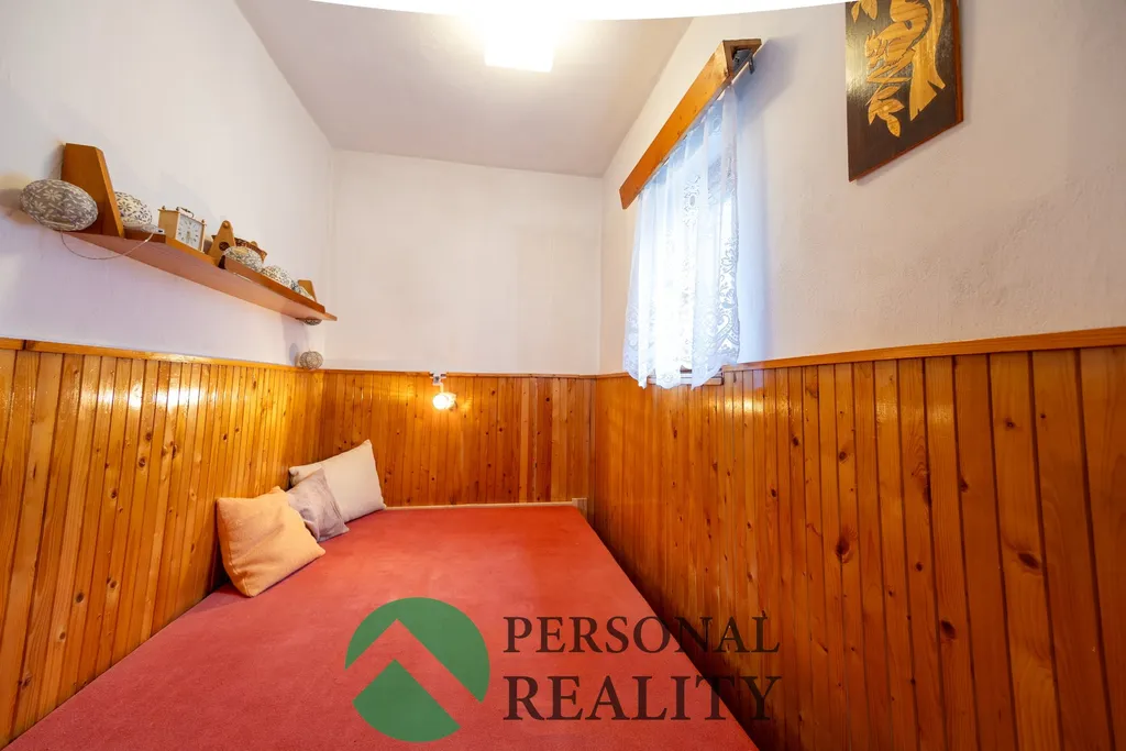 Dispozice přízemí: předsíň, sprchový kout, samostatné splachovací WC, koupelna s umyvadlem, chodba, kuchyně, menší ložnice a obývací pokoj se vstupem na prostornou terasu.