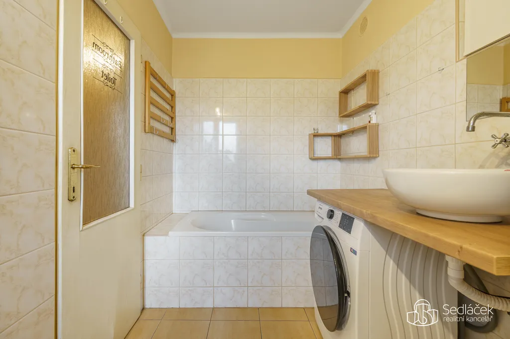 Byt disponuje prostornou koupelnou s vanou, toaletou a oknem, které zajišťuje přirozené větrání a denní světlo. Součástí je také velkorysá vstupní chodba s oknem, která nabízí dostatek úložného prostoru.
