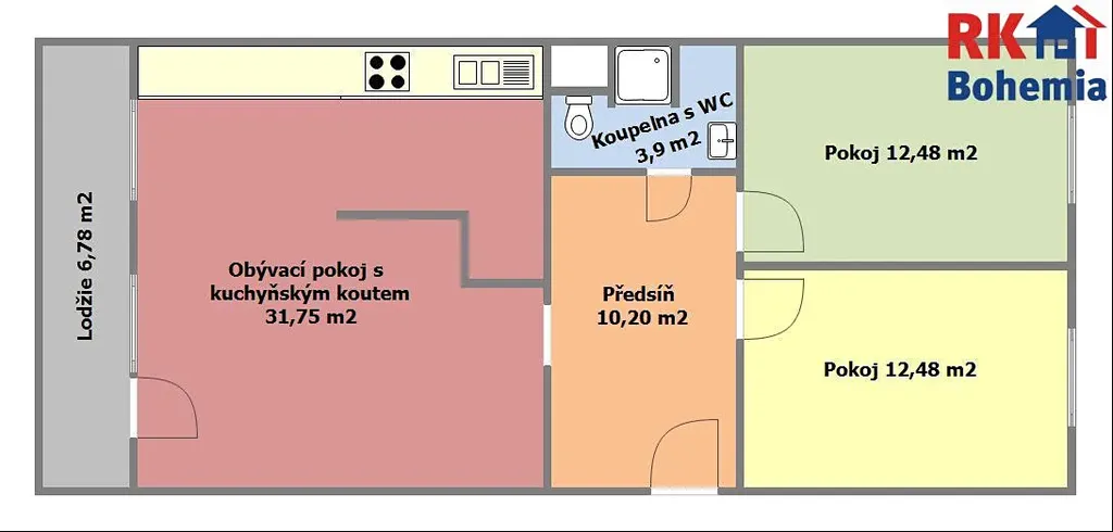 - Skvělá dispozice: Velkorysý obývací pokoj s kuchyňským koutem (31,75 m2), dva samostatné pokoje (každý 12,48 m2), koupelna (2,86 m2), samostatné WC (1,04 m2) a prostorná předsíň (10,2 m2).