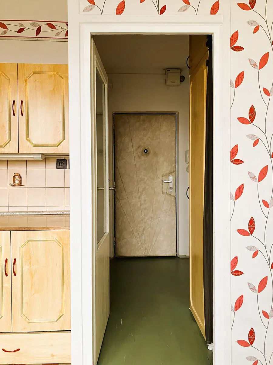 Byt disponuje vstupní chodbou s úložným prostorem, kuchyní s jídelnou, koupelnou se sprchovým koutem, umyvadlem a WC a obývacím pokojem s dřevěnou podlahou a se vchodem na zasklenou lodžii s krásným výhledem na město Uničov a na pohoří Jeseníků. Za příznivého počasí je vidět i jeho nejvyšší vrchol Praděd. Náklady za topení jsou v bytě velmi nízké díky jeho umístění mezi ostatními byty ze všech stran a díky orientaci pokojů na východ. Internet je do bytu přiveden kabelem.