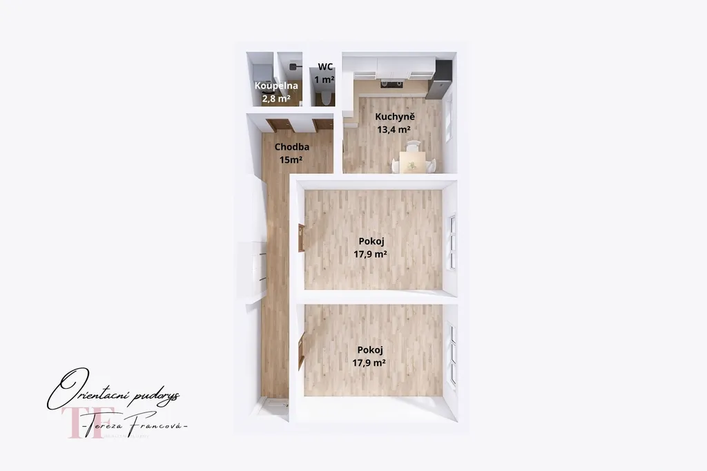 • Vybavení: kuchyňská linka včetně spotřebičů, lednice s mrazákem, jídelní stůl a židle, vestavěná skříň, koupelnové skříňky