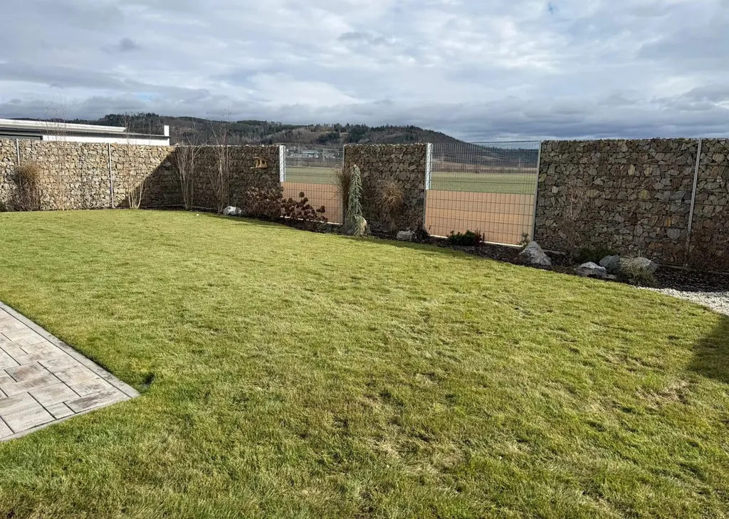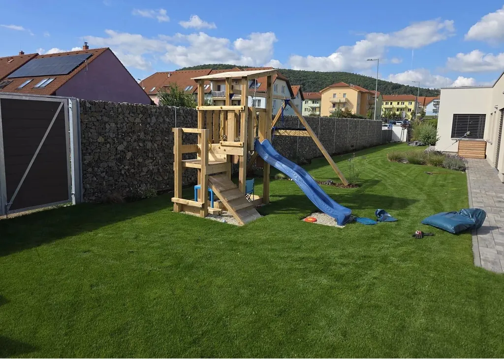 Zahrada o výměře 565 m je bez dalších staveb, osázena travou, okrasnými keři a dřevinami, zakrslými stromky a sezónními květinami, je zde přívod elektřiny pro budoucí pergolu a zahradní domek. Na zahradě je vybudovaný zavlažovací systém, dětské pískoviště a průlezka.