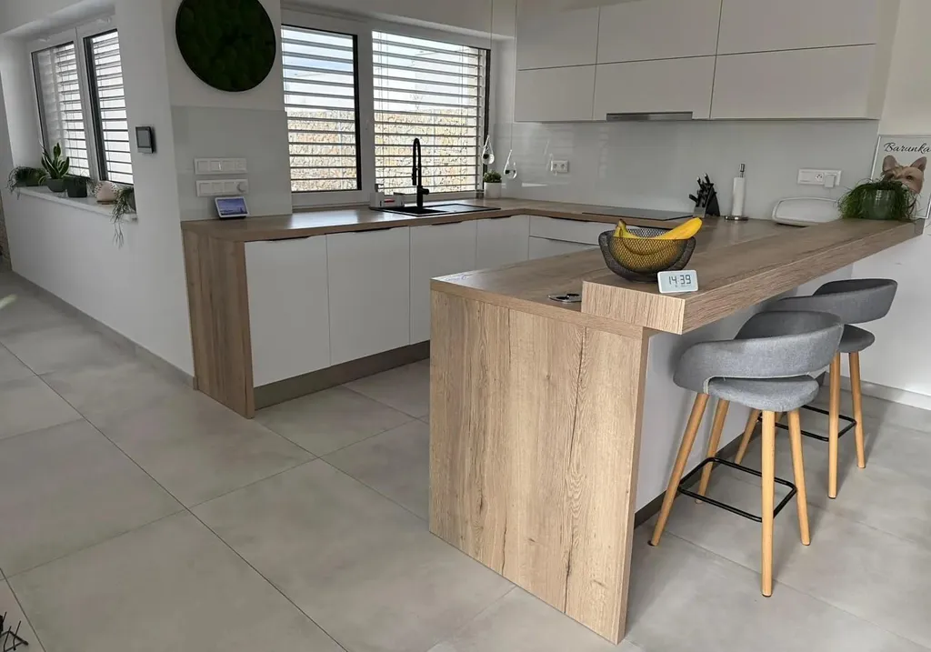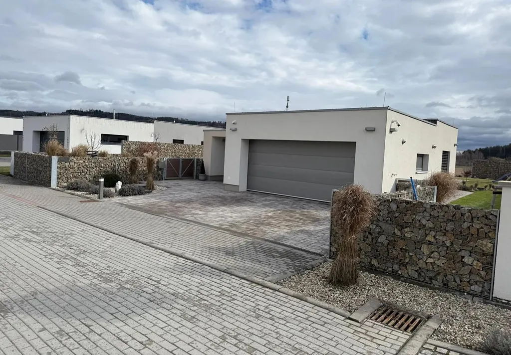 Rodinný dům zkolaudovaný v r. 2022 je zděný, jednopodlažní s rovnou střechou, garáží pro 2 osobní automobily 36 m a venkovním parkovacím stáním pro další 2 auta. Zastavěná plocha 209 m, podlahová plocha 173 m.