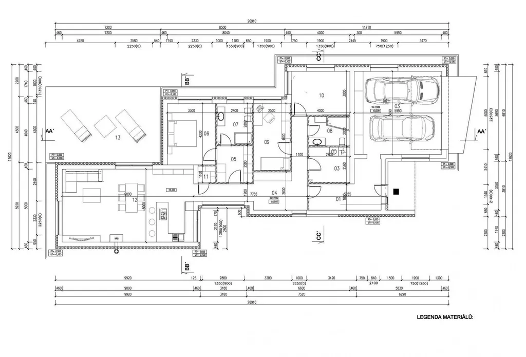 Dům má dispozici 4+kk s terasou umístěnou na jih. Pokoj s kuchyňskou linkou v ceně 600.000,- Kč včetně veškerých vestavných spotřebičů má výstup na terasu o výměře 35 m. Z ložnice je vstup do šatny a koupelny s umyvadlem, sprchovým koutem, WC a bidetem. Z chodby je vstup do pracovny, dětského pokoje, druhé koupelny s umyvadlem, vanou a WC, a do technické místnosti s pračkou, sušička a bojlerem na ohřev vody. Vstupní předsíň ústí do garáže pro dva osobní automobily.