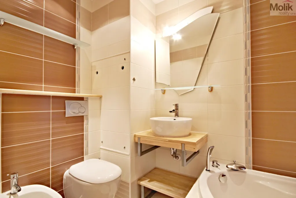 Byt je v udržovaném, rekonstruovaném stavu. Kuchyň je vybavena kuchyňskou linkou na míru do tvaru L s vestavěnými spotřebiči. Koupelna je zděná s rohovou vanou, závěsným WC a bidetem. V obytných místnostech jsou parketové podlahy, v kuchyni a chodbě plovoucí podlaha. V předsíni se nachází velká vestavěná skříň s posuvnými dveřmi.