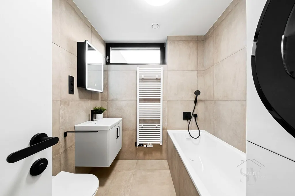 Koupelna je provedena v nadstandardu – sanitární keramika Villeroy & Boch, komfortní vana, kvalitní obklady, úložné prvky na míru, pračka + sušička Bosch.