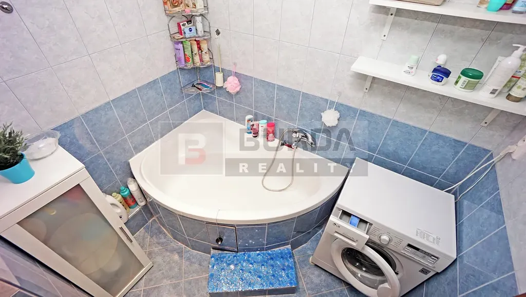 Koupelna je vybavena rohovou vanou, umyvadlem se skříňkou, zrcadlem a poličkami, WC, přípojkami pro pračku, keramickým obkladem a dlažbou. Pračka nezůstane.