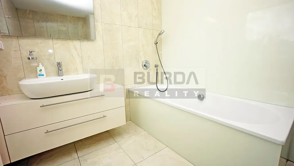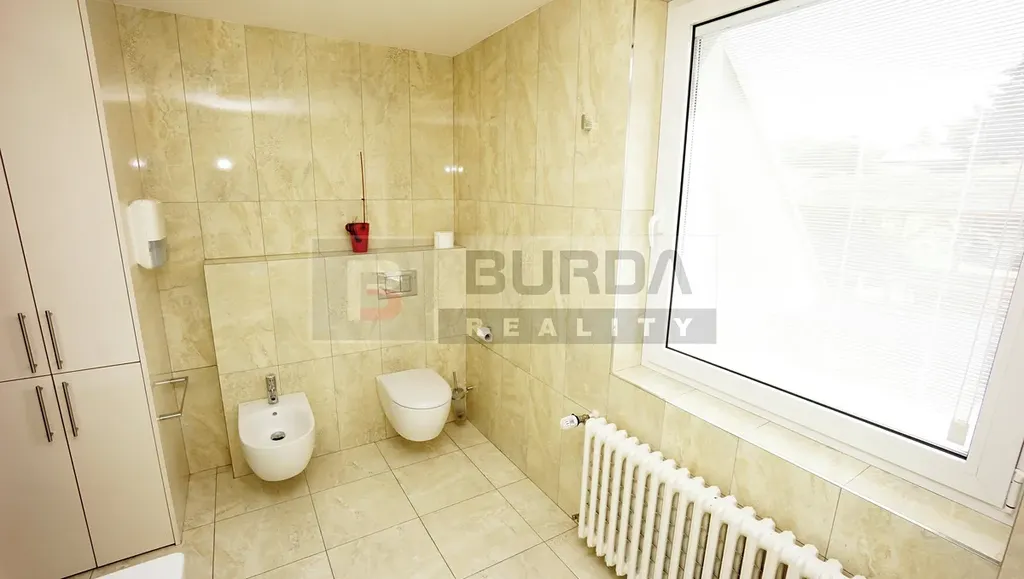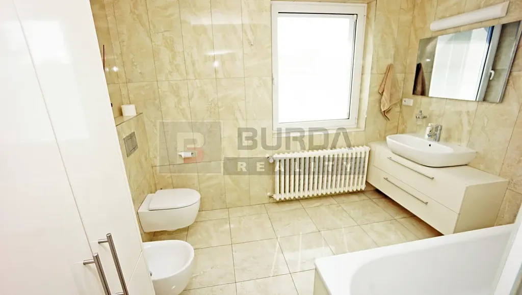 V koupelně v 1NP je kvalitní litinová smaltovaná vana zn. Kaldewei, umyvadlo Kaldewei s baterií Grohe, WC Geberit se splachováním Aquaclean, bidet, radiátor a obklad nad vanou lacobel.