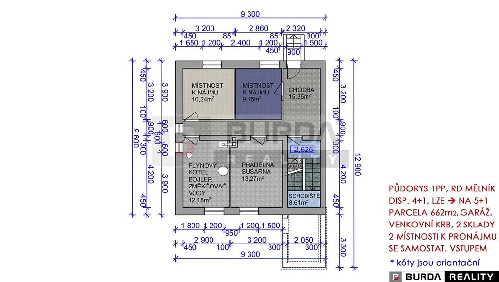 1.PP = suterén: dva pokoje (kanceláře), prádelna se sušárnou a kotelna s el. bojlerem Dražice o objemu 200 l na ohřev vody a plyn. kotlem Destila ovládaným termostatem, s měď. rozvody k litinovým radiátorům s termostatickými hlavicemi a se změkčovačem vody MilvitWater. V suterénu jsou přípojky pro pračku.