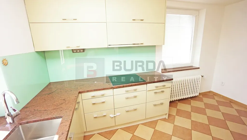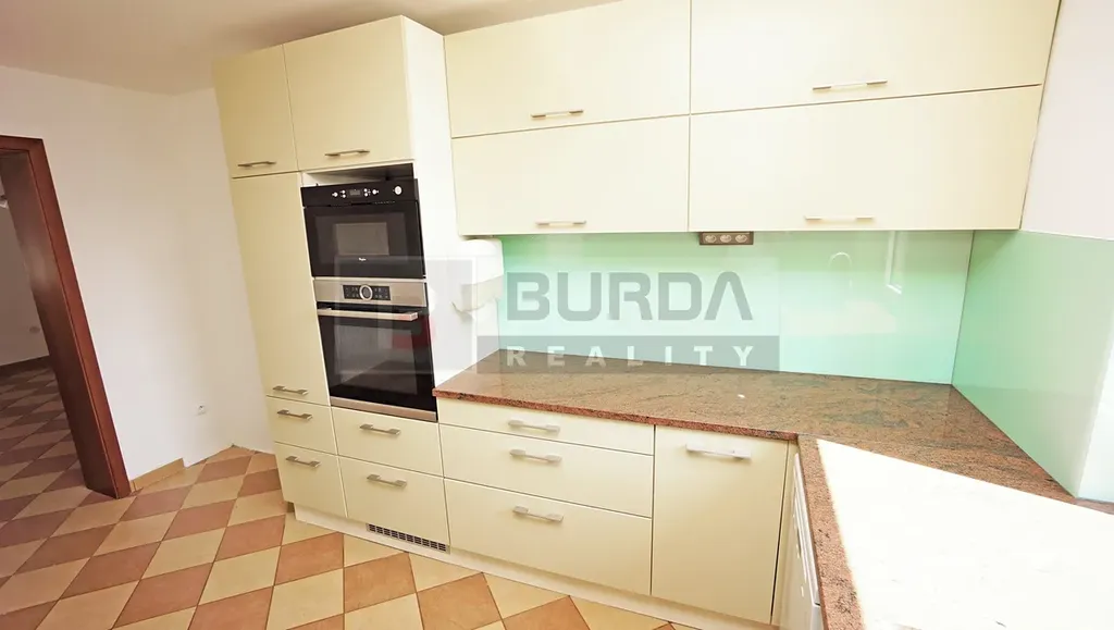V kuchyni je kvalitní lakovaná kuchyňská linka na míru s žulovou deskou Multicolor, s nerezovým dřezem Franke s baterií. V lince je el. indukční deska Bosch, el. trouba Bosch, mikrovlnka Whirpool, volně vsazená myčka Miele (zůstane) a digestoř s odtahem. Obklad tvoří kombinace skla a lacobelu.