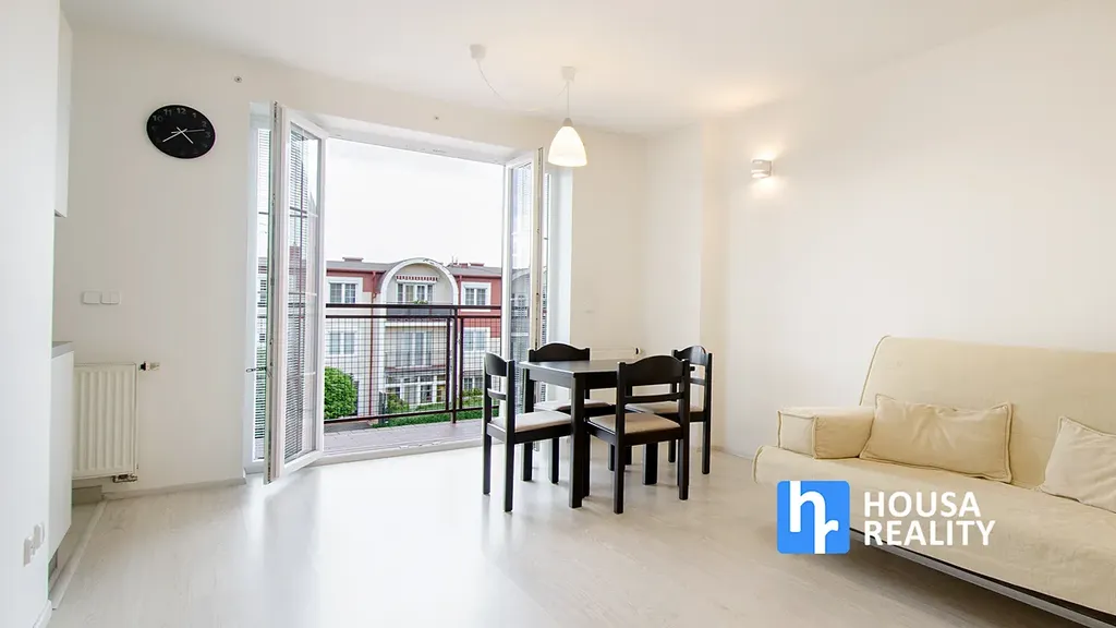 Byt se skládá z velkého obývacího pokoje s kuchyňským koutem, ložnice se šatnou, koupelny s vanou, samostatného WC a vstupní chodby. Z obývacího pokoje je přímý vstup na balkon širokými dvoukřídlými dveřmi s východní orientací do ulice plné zeleně.