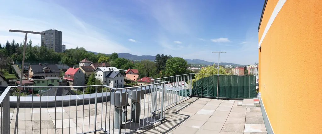 Dlouhodobý pronájem slunného a zcela nekuřáckého bytu 1+1 (38 m²) v poslední 6.nadzemním podlaží bytového domu s úžasnou střešní terasou a velikým balkonem - nechybí ani přímý výhled na Ještěd a celý hřeben Lužických hor. Rezidenční bytový komplex z roku 2006 byl navržen významným pražským architektem – www.pxpstudio.com / KOLAUDACE 26.8.2005. Hlavní dominantou a předností bytu je jednoznačně střešní terasa velikosti 16 m², kde si vychutnáte každodenní západ slunce se sklenkou dobrého vína; bonusem navíc je veliký balkon s jižní orientací a výhledem do zeleného odpočinkového atria - mimo hlavní příjezdovou komunikaci.