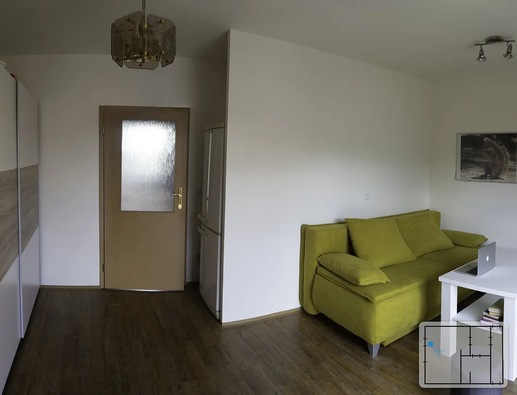 Jedná se o čistý a pečlivě udržovaný byt, částečně zařízeno nábytkem na míru, zajímavá vstupní hala se dvěma okny - přirozené denní světlo.Dispozice bytu: obývací pokoj 20 m² malá oddělená kuchyňka - rohová kuchyňská linka v odstínu buk (2009) je doplněna elektrickým sporákem se sklokeramickou deskou; prostorná koupelna vybavena vanou, přípojka na pračku, WC součástí. V bytě jsou žaluzie, garnyže, stropní svítidla.