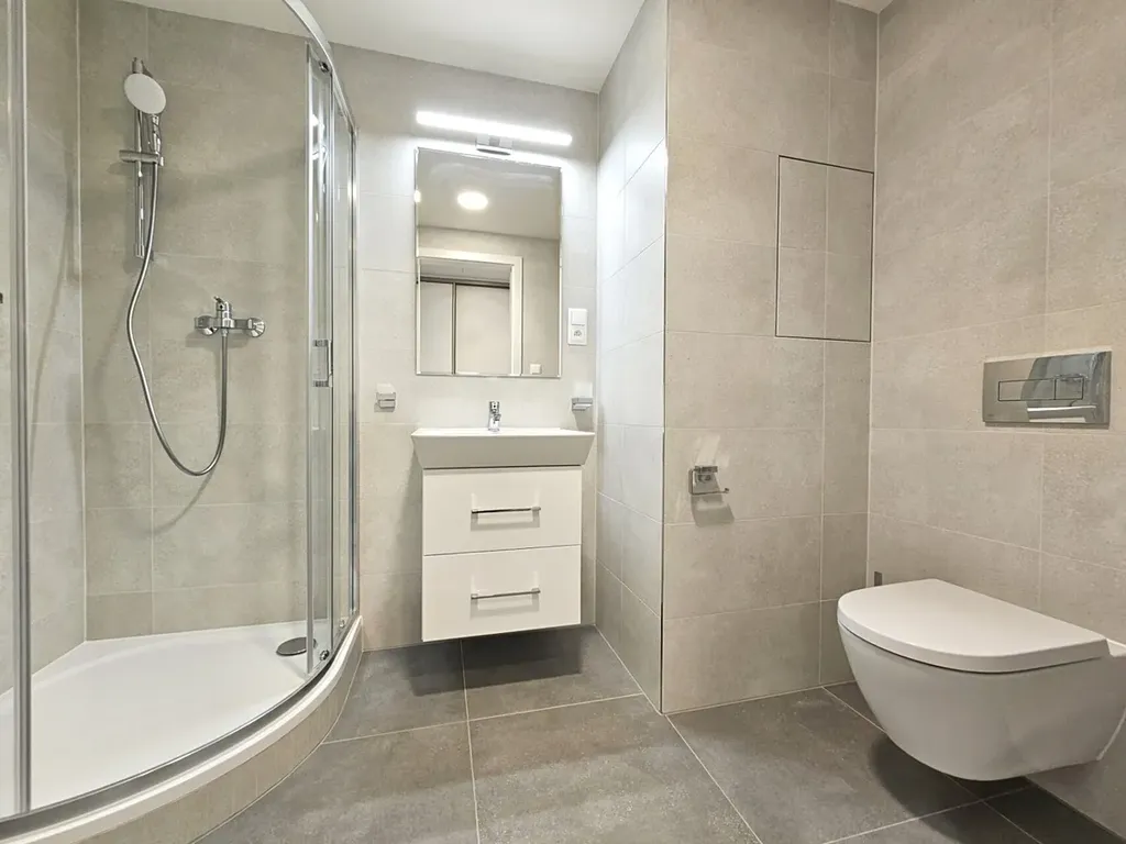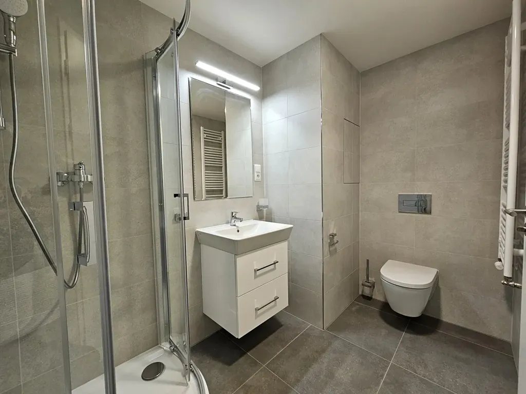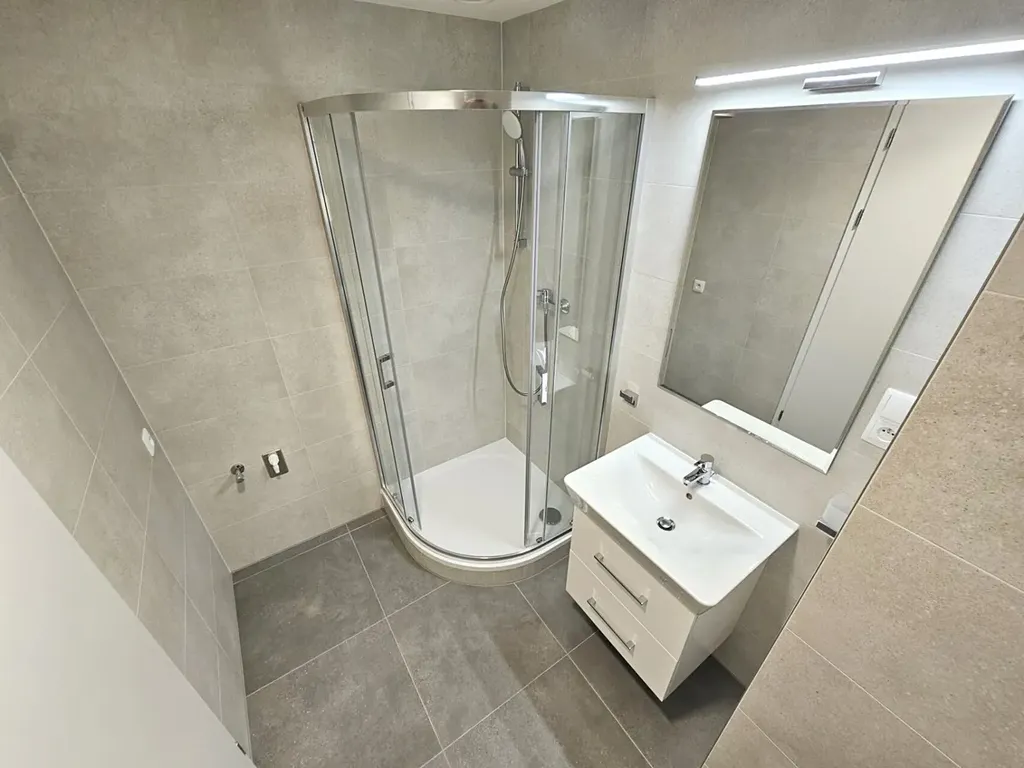 Koupelna se sprchovým koutem a s WC a je zde i místo na pračku (možné zařídit).
