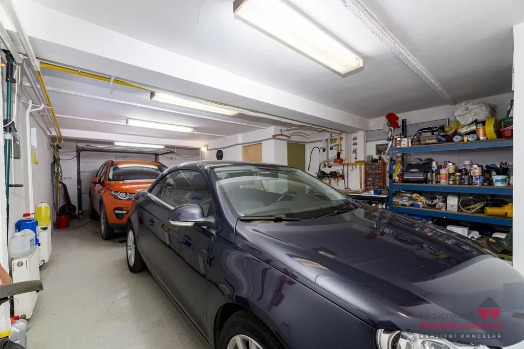 Střešní krytina je z kanadského šindele. Součástí domu je garáž pro dvě auta v suterénu, další parkování je možné na pozemku.