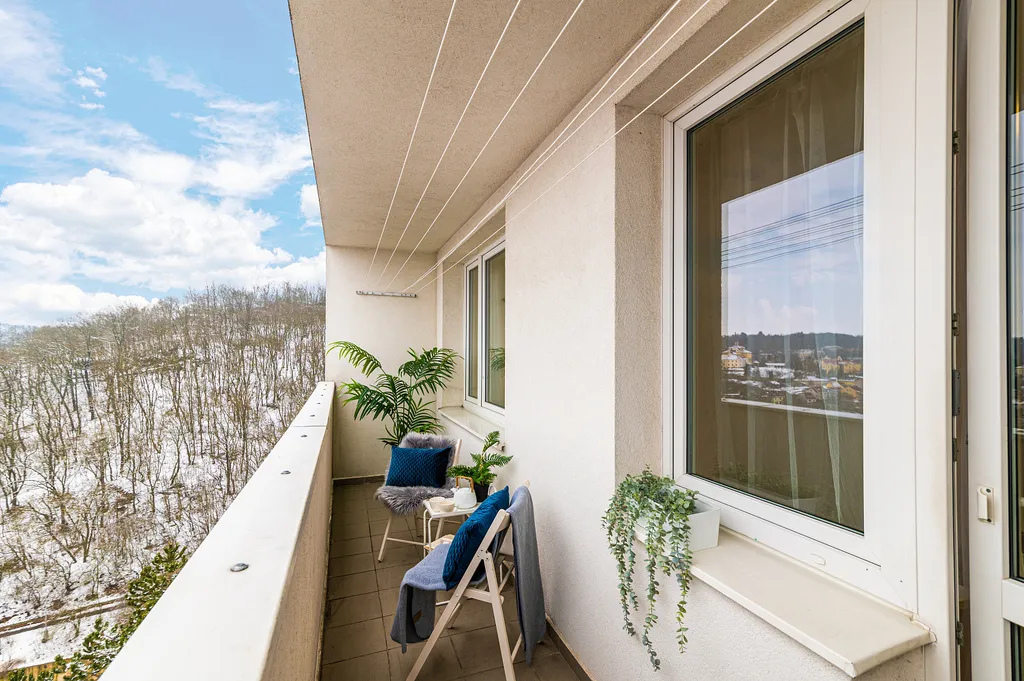 Lodžie je skutečným bonusem – dostatek prostoru pro posezení, ranní kávu i klidné večery s výhledem, který vám nikdo nevezme.