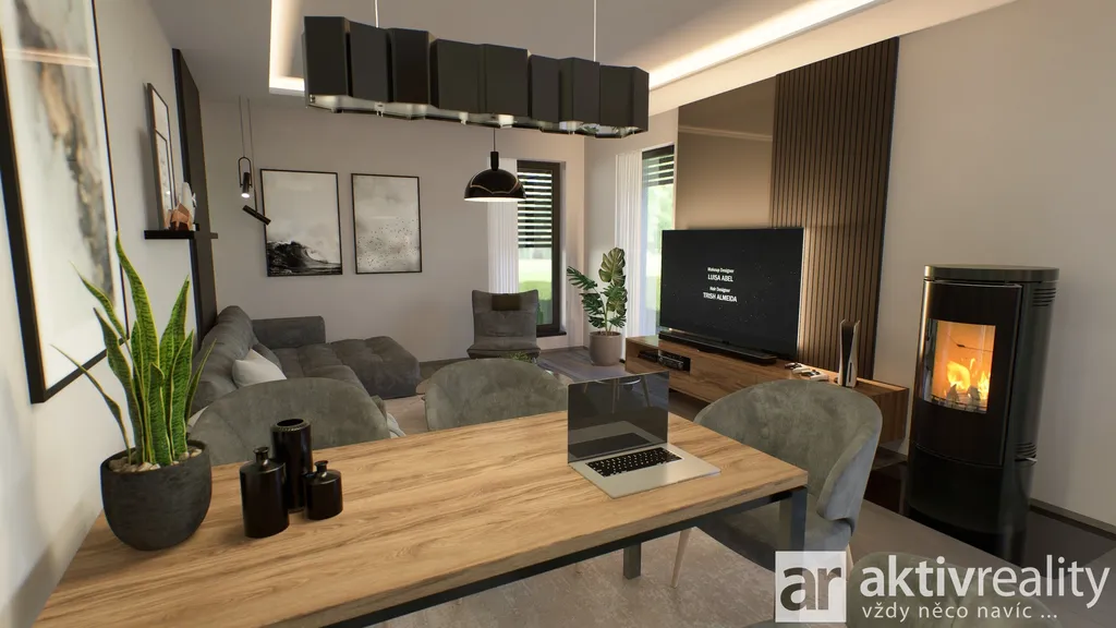 Dům je koncipován jako prostorné a zároveň kompaktní řešení pro větší rodinu, která ocení jasné oddělení denní a klidové části. V přízemí o výměře 84,8 m² dominuje otevřený obývací prostor s kuchyní o velikosti 41,4 m² s přímým vstupem na terasu. Dále je zde pracovna (11,9 m²), koupelna, samostatná technická místnost, komora a plnohodnotné schodiště do patra. Dispozice je navržena tak, aby minimalizovala nevyužité plochy a nabídla maximální praktičnost.