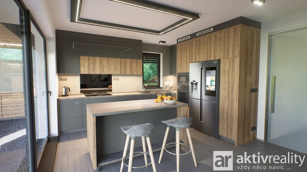 Architektonicky dům vychází z moderního minimalistického pojetí se šikmou střechou a velkoformátovým prosklením obytné části. Díky tomu je interiér přirozeně prosvětlený a opticky propojený se zahradou.