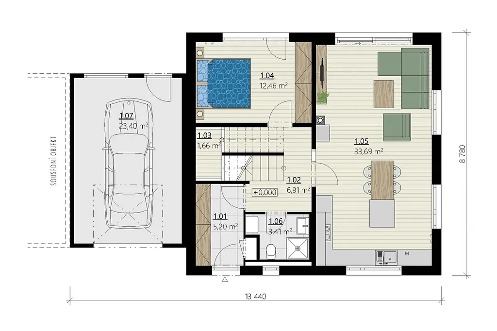 Rodinný dům K 130 je navržen jako jednopodlažní objekt s obytným podkrovím zastřešený sedlovou střechou. V rámci projektu Újezd u Brna je koncipován jako volně stojící dům, dvojdům nebo jako řadový dům. Dispozičně spadá do kategorie 5+kk. Součástí domu je garáž, která je od domu provozně oddělena. Hlavní vstup do objektu je z ulice do vstupní haly a dále pak do chodby se schodištěm, ze které je přístupný hlavní obytný prostor s jídelnou a kuchyňským koutem, dále koupelna s technickým zázemím a pokoj. Ve 2.NP jsou umístěny tři pokoje a koupelna.