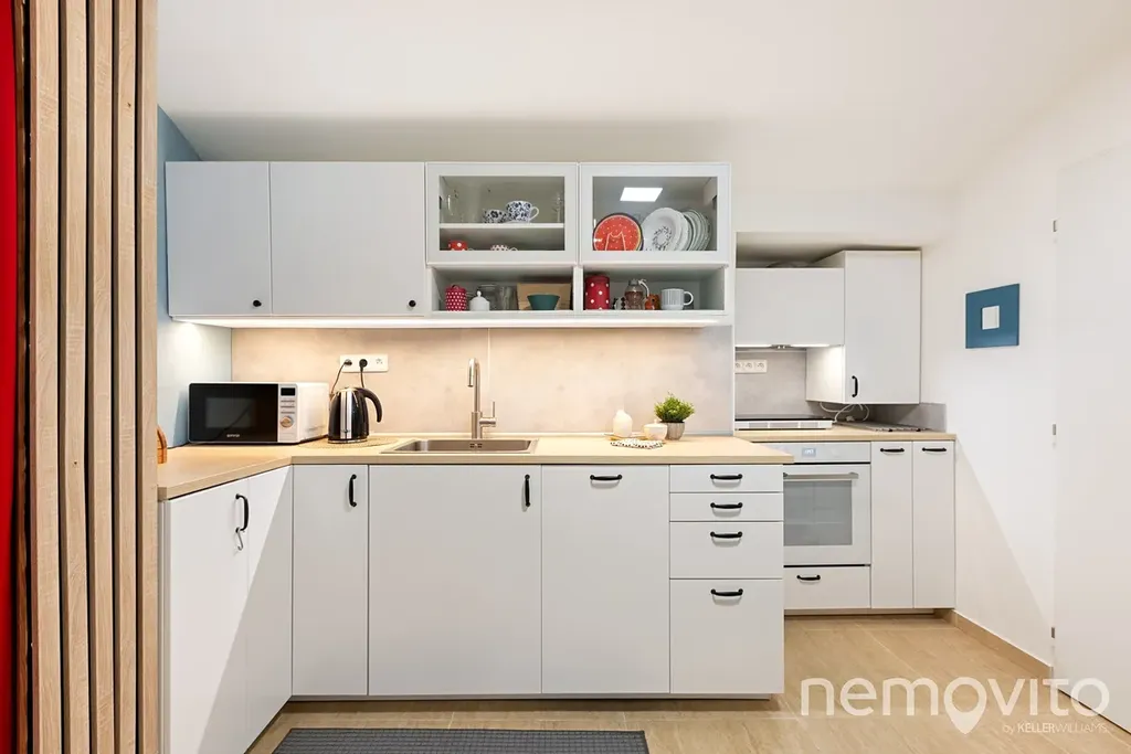 Místnost s kuchyní je aktuálně přepažena vytvořenou příčkou, která oddělila linku od vstupního zádveří. V něm je prostor na botník nebo šatnu. Vstup do obou pokojů je tak od sebe oddělen a nejsou průchozí. Koupelna je vybavena sprchou, WC je samostatně. Vytápění a ohřev vody je řešen elektřinou (bojler, konvektory - náklad 4.000 Kč měsíčně s kompletním provozem domácnosti).