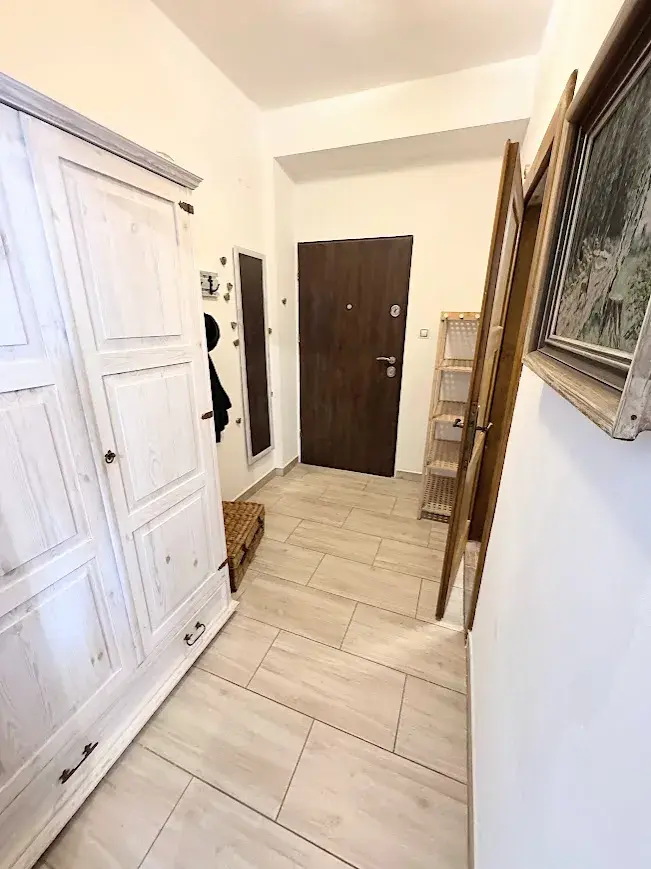 Byt má kuchyňskou linku včetně všech vestavěných spotřebičů. Prostor je vytápěn el. přímotopy a pro větší tepelný komfort a příjemnou atmosféru jsou zde i krbová kamna.