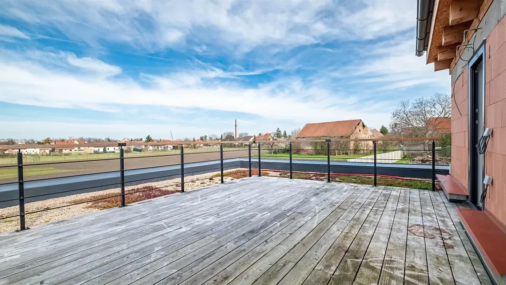 V 1.patře Vás hned zaujme prostorná hala se šikovně osazenou pracovnou. Dále zde máte dva prostorné dětské pokoje se vstupem na jednu ze dvou teras, koupelnu se sprchovým koutem a vstupem na druhou terasu, samostatné WC a v neposlední řadě ložnici majitelů s příjemně velikou šatnou a také vstupem na druhou terasu. Z teras máte panoramatický výhled do kraje a opravdu skvělé tu budou zejména západy slunce, protože na západ od tohoto domu již žádné stavby nejsou a v územním plánu ani nejsou plánovány. Součástí domu je také technická místnost pro skladování zahradní techniky, kol nebo motocyklu.