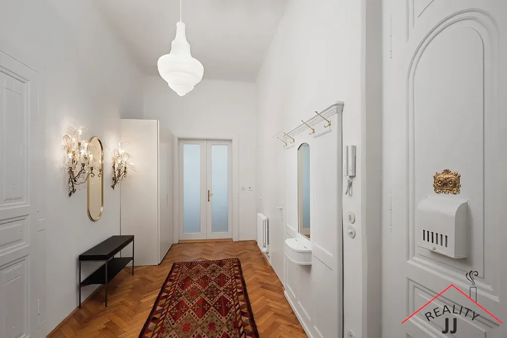 V bytě jsou parketové podlahy, štukové stropy a křišťálové lustry.