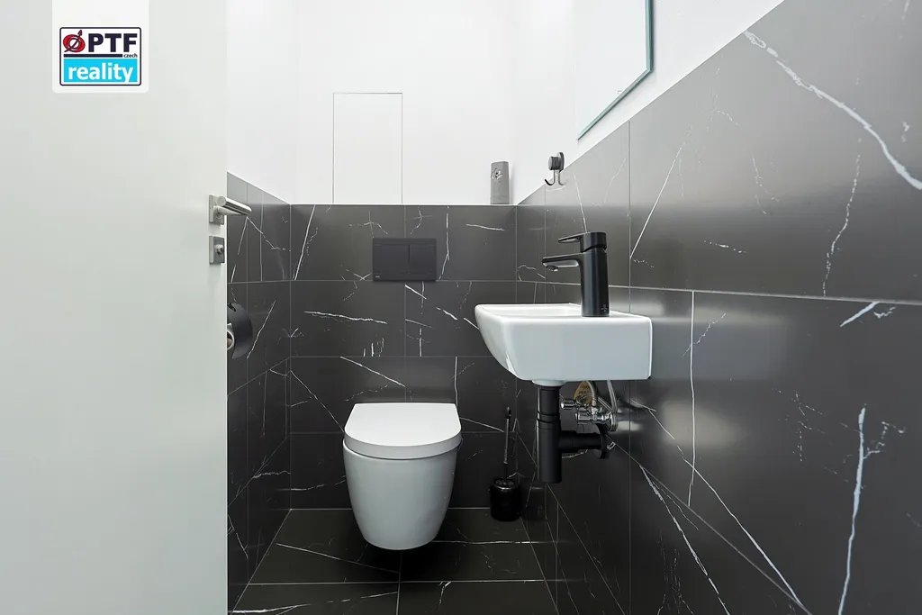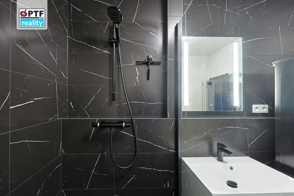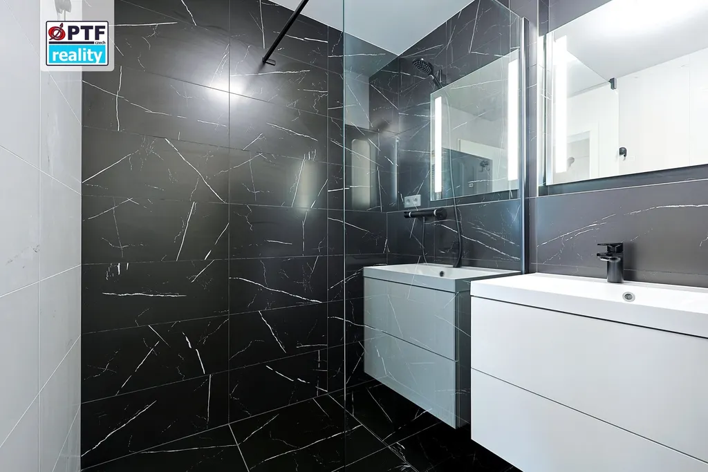 Koupelna je kapitola sama o sobě. Materiály a zpracování, které v novostavbách běžně nepotkáte. Žádný developer standard, žádný kompromis.