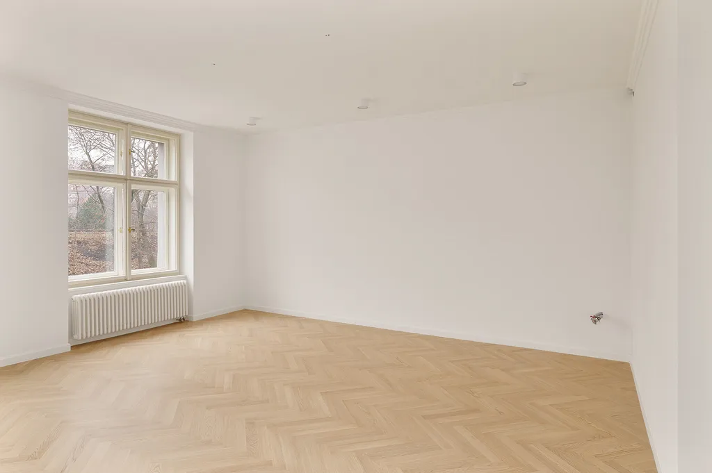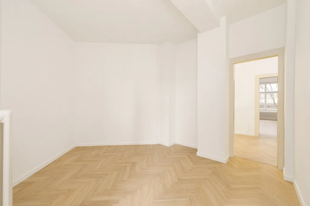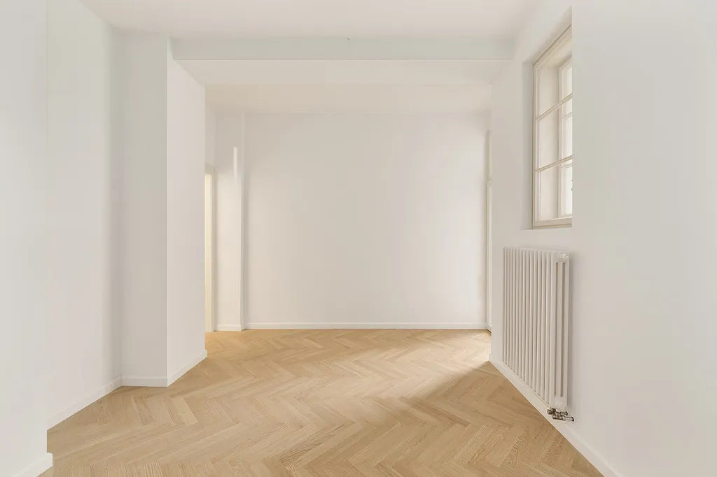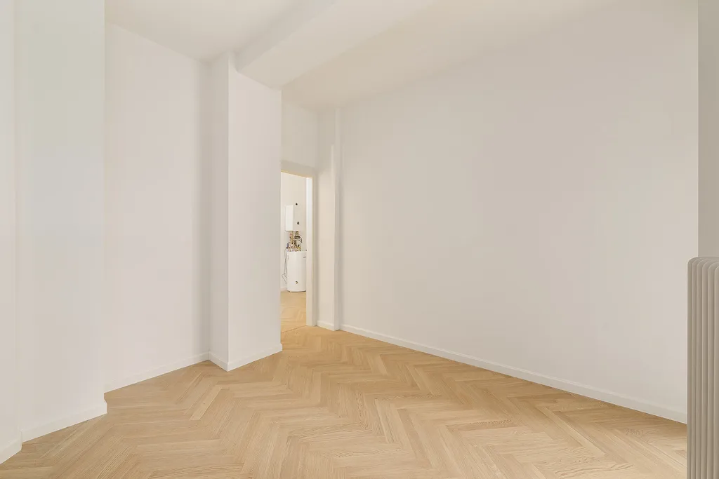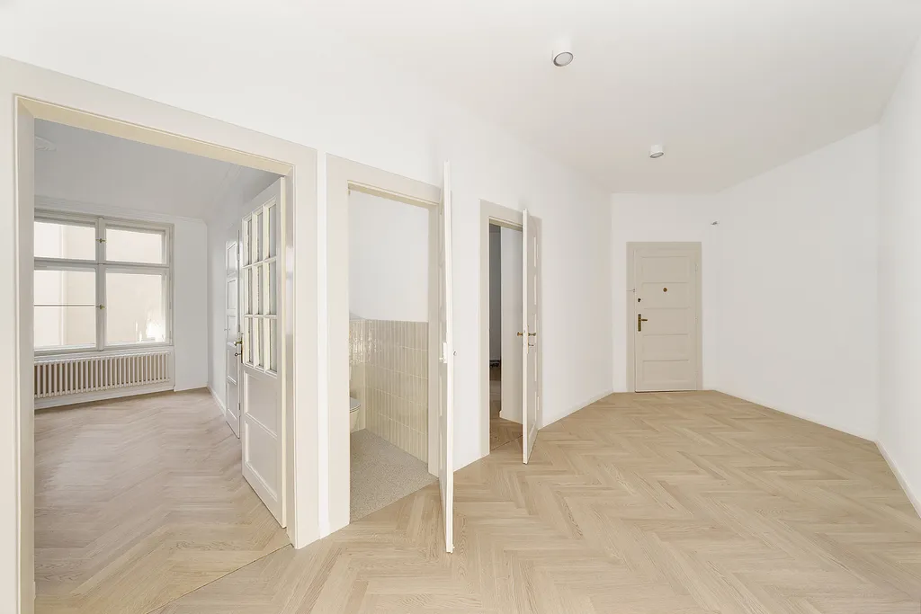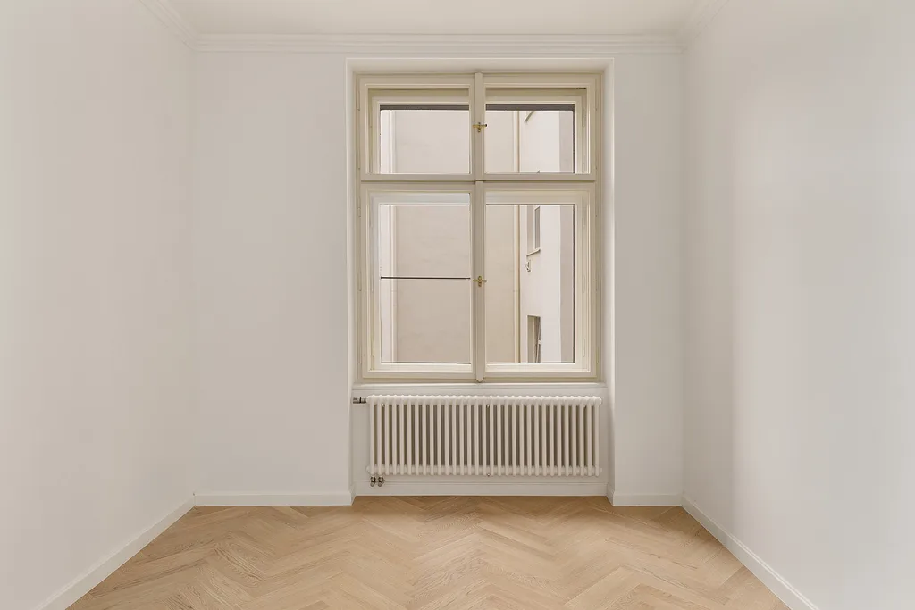 Kvalitní materiály a zachované detaily: nové dubové parkety, špaletová okna, repasované dveře, prémiové obklady